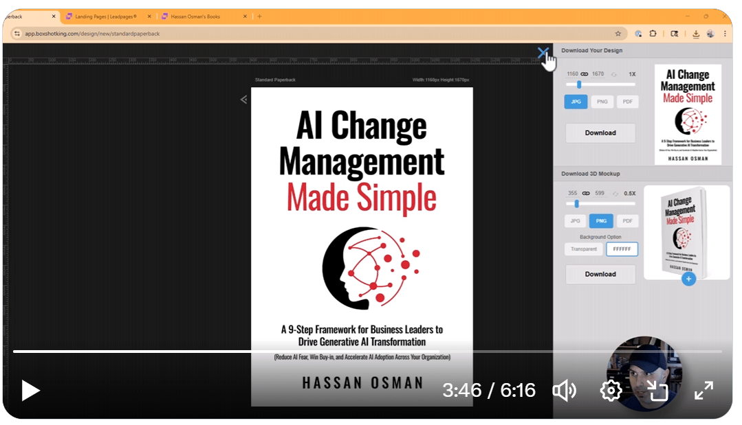 I turn the 2D cover into a 3D image (using a tool called BoxShotKing)